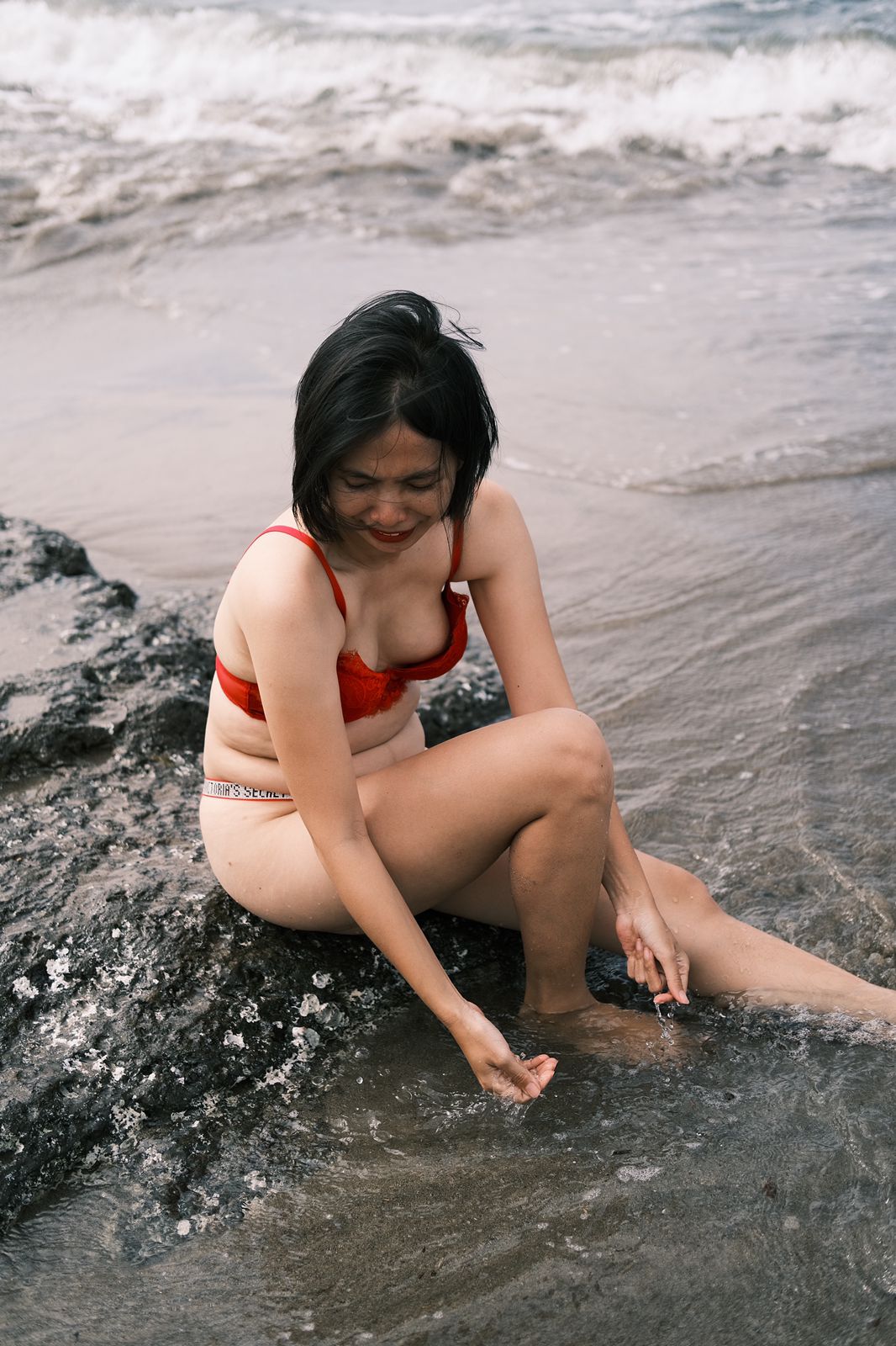 Tammy poses in a red bra