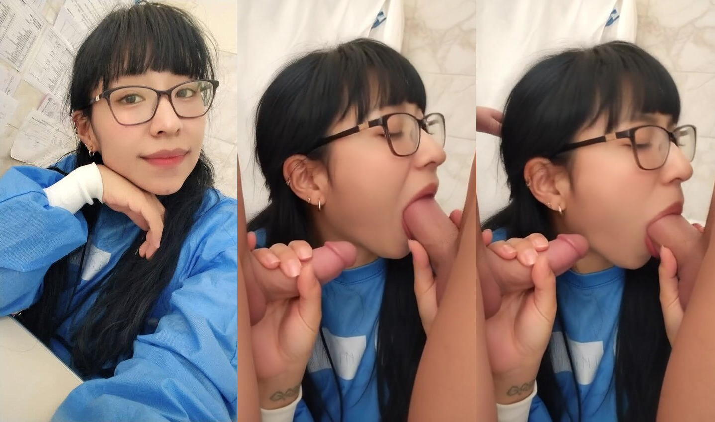 Slut With Glasses Sucks Two Cocks