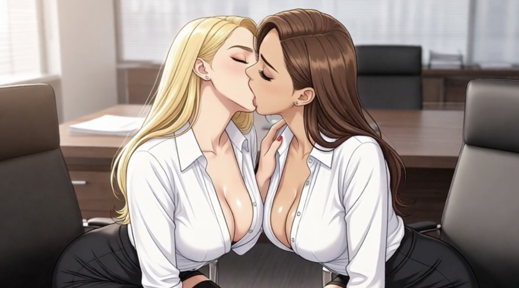 Anime Lesbian Hentai Office Girls in Stockings and skirt - Kissing then Pussy Lick and Big Tit Suck